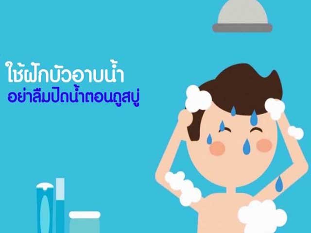 จะเปิดน้ำทิ้งไปทำไมหากในระหว่างที่สระผมหรือถูสบู่ไม่จำเป็นต้องใช้น้ำอยู่แล้ว ฉะนั้นจึงควรปิดน้ำให้สนิทเสียก่อน แล้วค่อยเปิดน้ำอีกครั้งหลังจากชำระร่างกายด้วยสบู่เสร็จ