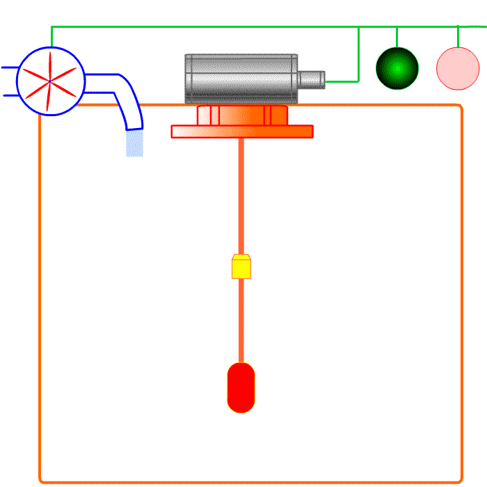 แบบที่ 2 แท้งค์น้ำ 2 ใบ ลูกลอย 2 ตัว ใช้ระดับน้ำจากแท้งค์น้ำชั้นล่าง ควบคุมให้ปั๊มน้ำ สูบน้ำขึ้นชั้นบน, ชั้นล่าง ต่อสายไฟลูกลอยที่ หน้าสัมผัสปิด B1 B2, ที่ชั้นบน ต่อสายไฟลูกลอยที่ หน้าสัมผัสเปิด A1 A2